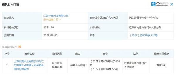 新浪门窗频道讯 近日,江苏中南木业有限公司成为被执行人,执行标的1,234,170元,案号为(2022)苏0684执725号,系首次执行。