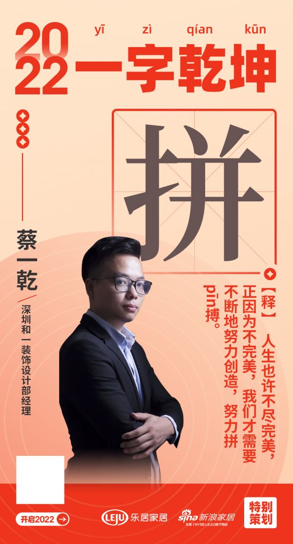 在“2022一字乾坤”活动中, 深圳和一装饰设计部经理蔡一乾用「拼」表达了2022年的规划和目标: