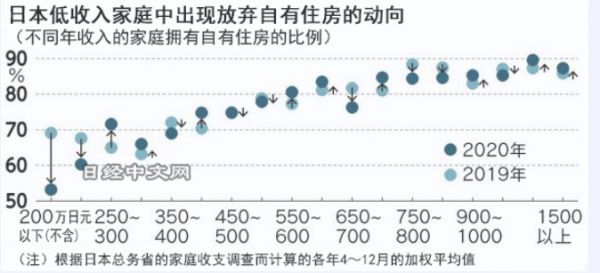 日本经济新闻去年4月报道称,综合日本总务省的家庭收支调查来看,年收入在200~250万日元(约合人民币12~15万元)的家庭的自有住房比率为60.3%,比2019年下降7个百分点。年收入不满200万日元的家庭为53.2%,下降了16个百分点。不少民众因没有工作、薪资减半和无力偿还贷款等原因,卖掉自己的房子。