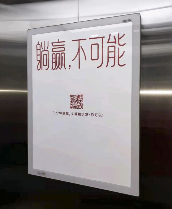 大热的“1分钟躺赢”活动,更是通过电梯里吸引人眼球的海报,吸引了不少顾客到店体验“躺赢”。