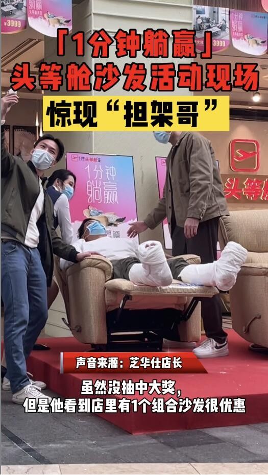在今年2月5日至3月20日期间,前往芝华仕头等舱沙发线下门店,躺满1分钟即有机会免费赢取头等舱沙发。这次“担架哥”参加的“1分钟躺赢”活动,一共准备了5000张头等舱沙发。