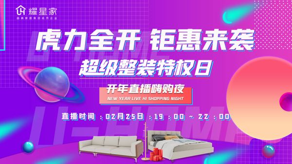 虎力全开,钜惠来袭!2022年2月25日,耀星家2022超级整装特权日、开年直播嗨购夜精彩呈现,本次活动耀星家联合全国7城,开启年度第一钜惠。直播中耀星家围绕产品、模式、理念等诸多议题和业内人士以及合作者展开交流。超级整装特权日当天耀星家现场准备了丰厚的礼品、丰富的行业内容、诚意满满的开业特权、赋能支持亮相在直播间。