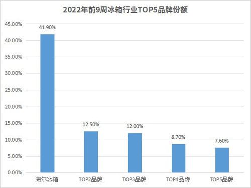 从目前的市场数据看,头部冰箱品牌优势进一步加强。截至前9周,TOP5品牌占据了总市场的8成份额,其中,海尔冰箱份额为41.9%,其余TOP2到TOP5品牌份额分别为12.5%、12.0%、8.7%、7.6%,份额相加为40.8%。