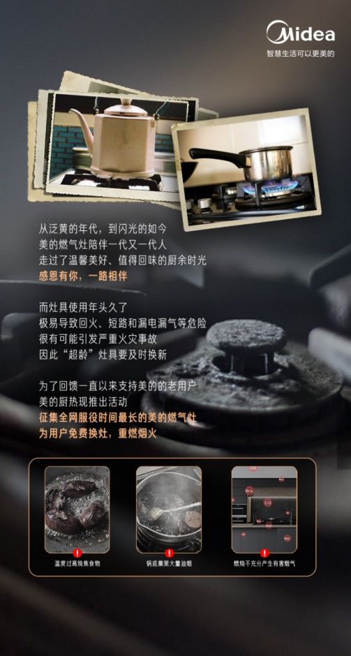 美的感恩一路上消费者们的陪伴,解锁换新福利,开启“薪火相传 烟火不熄”活动,不仅有超值换新券,还有从全网征集服役时间最长的美的燃气灶的惊喜活动,参与活动的用户即有机会免费换新灶,重燃人间烟火。