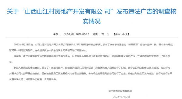 晋中市市场监督管理局称,2022年3月21日晚,山西山江村房地产开发有限公司借助MU5735航班事故热点新闻,发布了含有事件元素的“新晋福邸”房地产宣传广告。晋中市市场监管局第一时间监测到后,连夜组织执法人员前往该公司售楼部进行调查核实。