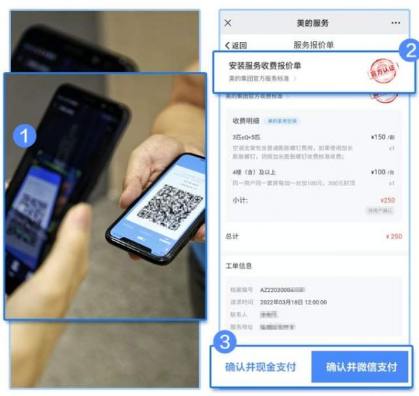 不仅如此,在针对收费问题上,美的服务搭建透明化的收费服务。如有用户对收费标准不明朗时,可以第一时间打开“美的服务”微信公众号,查看服务收费标准,做到商户之间信息对称,极大地保护用户对于消费的知情权;完成报装/报修后,用户直接用微信扫描工程师出示的“专项收款二维码”,不再是以往上门工程师个人的收款码,这一变化拉近用户对美的服务的信任感;付完款的同时,点击获取“安装服务收费报价单“,即可查看每一笔收费的明细,明码标价刷新用户售后体验。