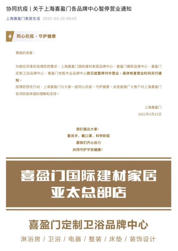 卖场快讯| 协同抗疫 上海喜盈门各品牌中心暂停营业通知