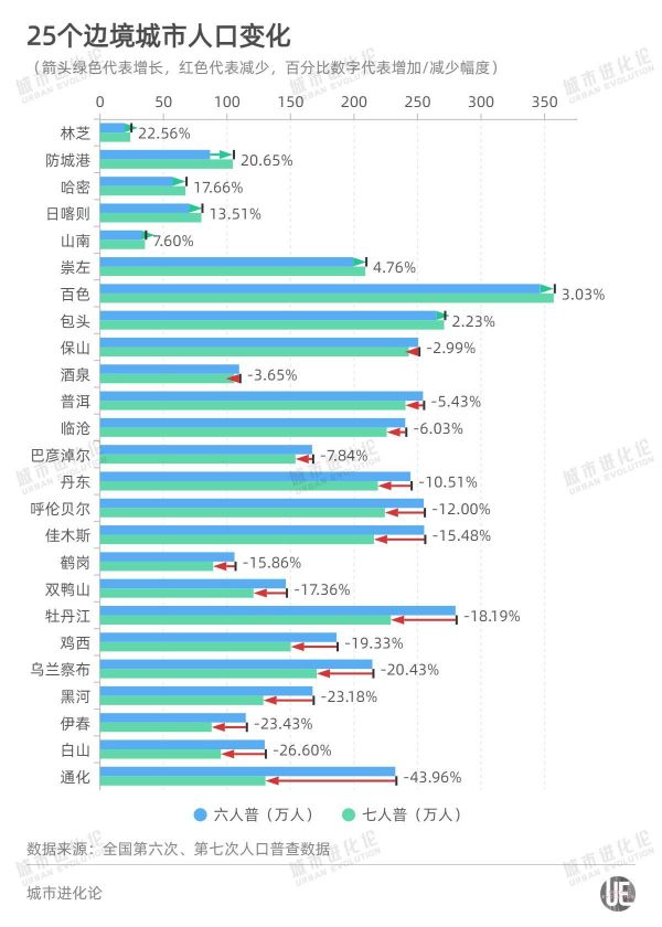 以25个地级市的情况为例。根据2010、2020两次人口普查数据来看,边境城市人口总体在十年间缩水463.7万人,增长率为-11.69%,有17座城市都存在常住人口负增长的情况。