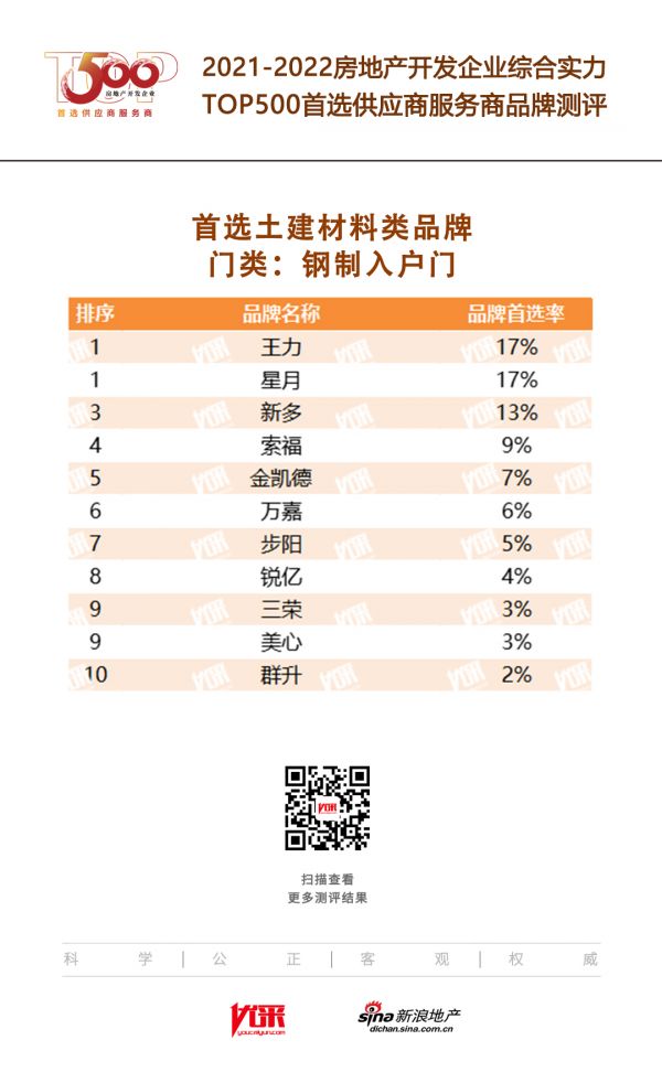 王力入选“2022房地产开发企业综合实力TOP500首选供应商·钢制入户门类”