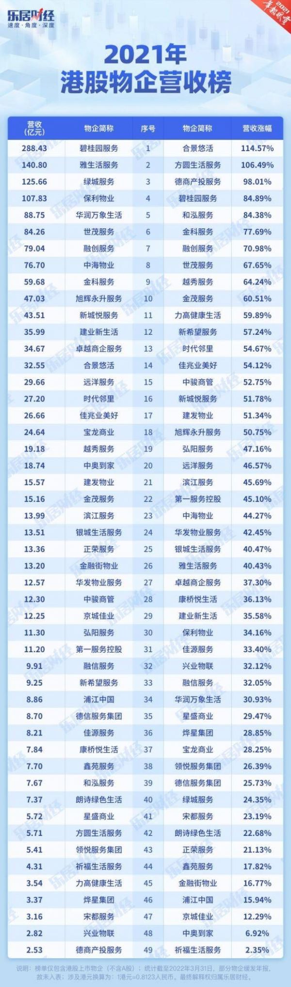 2021年港股物企营收排行榜,合景悠活营收涨幅名列第一