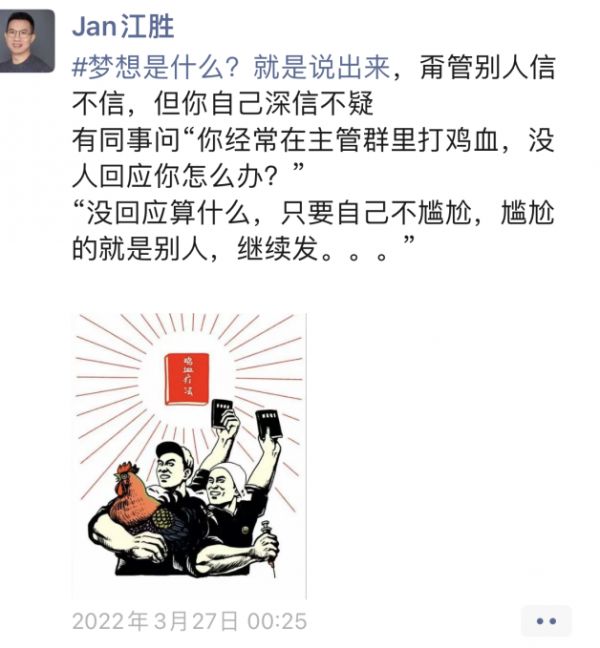 3月27日,他在朋友圈写下一句话:梦想是什么?就是说出来甭管别人信不信,但你自己深信不疑。