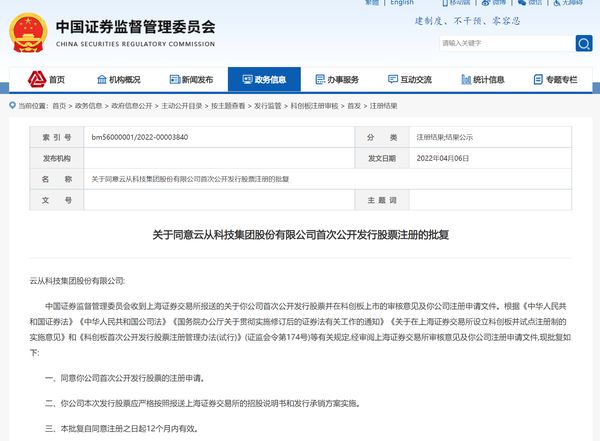 新浪家居智能家居频道讯 4月6日,中国证监会发布批复称,同意云从科技集团股份有限公司(下称“云从科技”)首次公开发行股票的注册申请。云从科技或将成为“AI四小龙”中首家成功登陆科创板的公司。