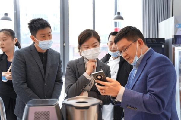 在方志华董事长的陪同下,佟大行副处长一行人参观了缤纷未来社区共享云厨房,亲自体验了从净菜柜到使用AI烹饪机器人进行烹饪的服务过程,并对正在建设并持续完善的未来社区便民项目“烹饪数字化,共享厨房”进行了深入地了解。