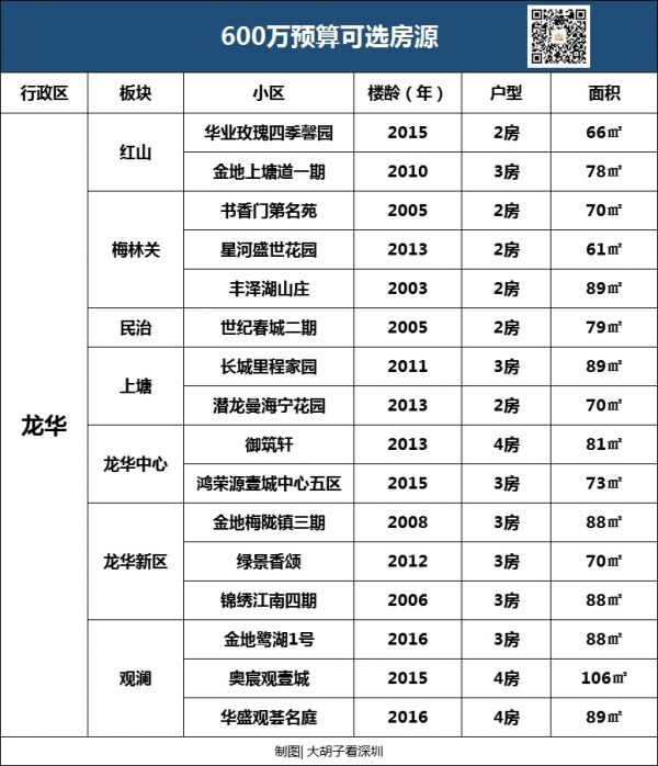 观澜片区,600万基本上都能选,如果是在龙华或者观澜上班,我觉得可以选这里的次新盘,如果是投资的话,不建议选这个板块。