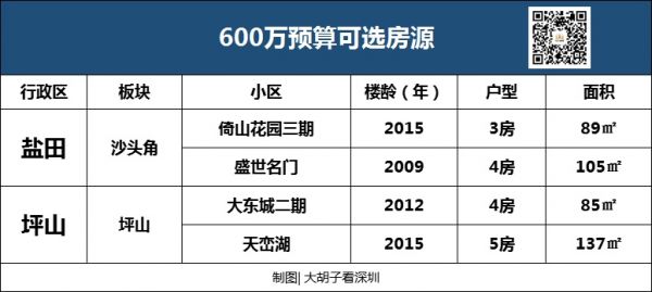600万,在其他区能选的板块不少,所以个人不建议买盐田,如果实在要选的话,可以选择沙头角的次新房,比如倚山花园。