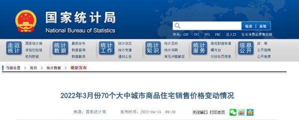 4月15日,国家统计局发布2022年3月70个大中城市商品住宅销售价格变动情况。