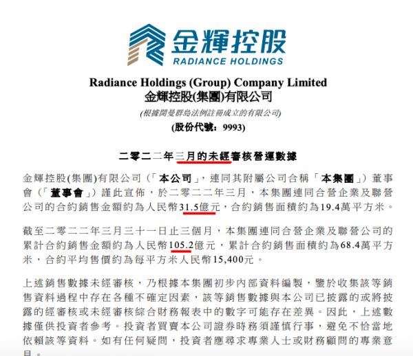 金辉控股前3月累计销售105亿单月微增3.3% 一次性偿付3.28亿元票据金额