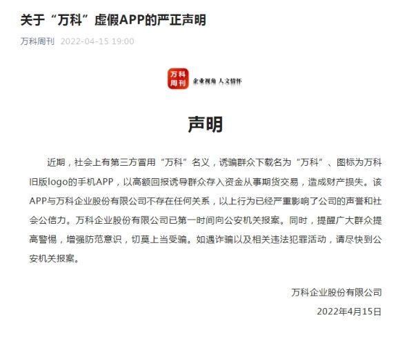 中新经纬4月15日电 “万科周刊”微信号15日发布声明称,近期,社会上有第三方冒用“万科”名义,诱骗群众下载名为“万科”、图标为万科旧版logo的手机APP,以高额回报诱导群众存入资金从事期货交易,造成财产损失。