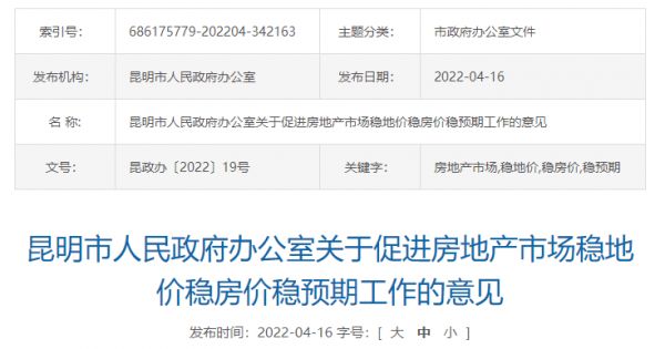据昆明市政府网站16日消息,昆明市人民政府办公室发布了《昆明市人民政府办公室关于促进房地产市场稳地价稳房价稳预期工作的意见》,共有八项25条。包括加快商业商务用房去化、纾解疫情期间房地产开发企业困难、鼓励多种方式回迁安置、优化住房金融服务等内容。