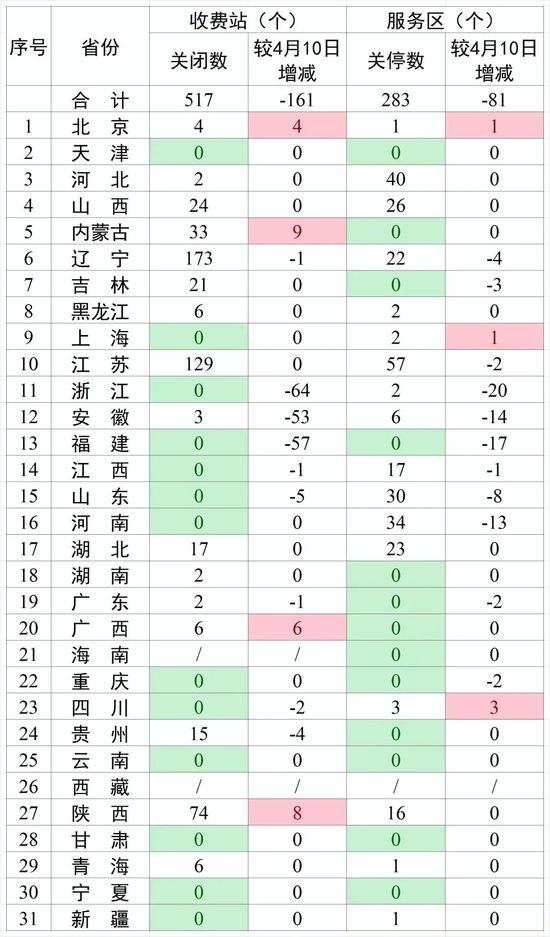 4月13日晚,交通运输部通报全国高速公路收费站和服务区关闭关停自查自纠情况。截至2022年4月12日24时,各省(区、市)高速公路共关闭收费站517个、占收费站总数4.79%,比4月10日减少161个,下降23.75%;共关停服务区283个,占服务区总数4.28%,比4月10日减少81个,下降22.25%。