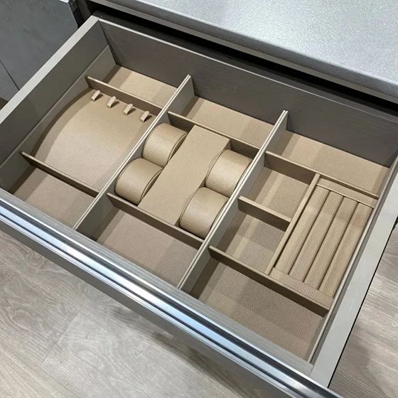 下地柜由一个大抽屉和同样三分层柜组成,除了直接拉满收纳力,悬空设计也更方便打扫。