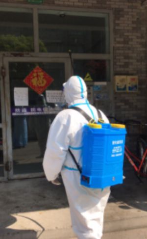 (张凤英在疫情封控期间,背负30斤重消毒桶在小区内消杀)