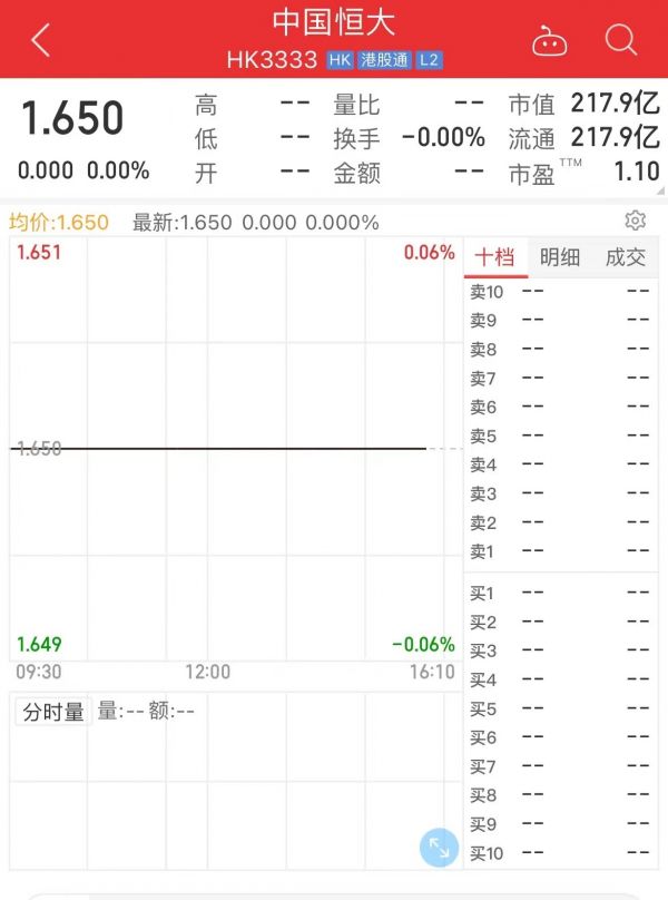 截至停牌前,中国恒大股价1.65港元/股,市值217.9亿港元。