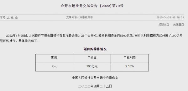 中国网地产讯 2022年4月25日,人民银行下调金融机构存款准备金率0.25个百分点,释放长期资金约5300亿元,同时以利率招标方式开展了100亿元逆回购操作。