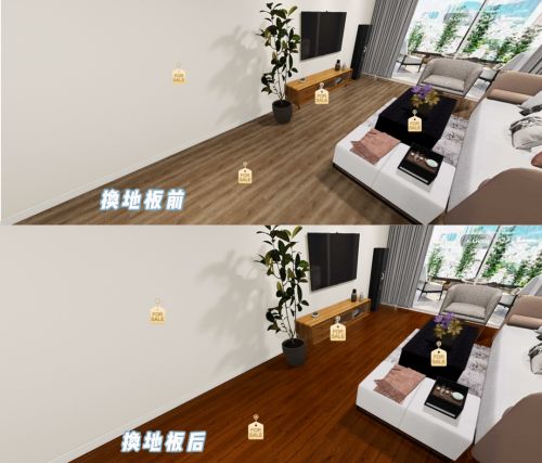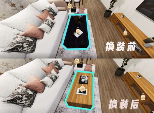 依托58同城、安居客的临感VR技术建模,家具商可以对不同品牌、不同型号的墙壁、地板、家具进行建模,录入“家具库”,供用户挑选。用户则可通过RENO VR产品,挑选自己心仪的单品放入VR房间。如果对某一件单品不满意,点击单品上的“换装”标签,即可轻松更换品牌、颜色、材质和规格,直至调整到最理想的效果。