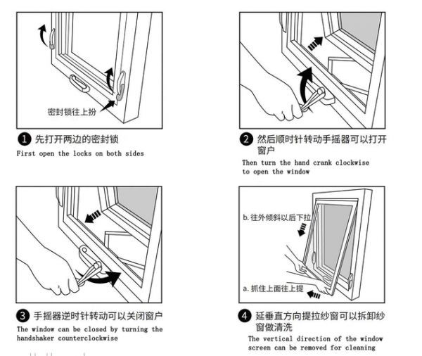 开关窗不需要把手伸到室外,从而达到了绝对的安全,本产品通过美国跟加拿大高标准,在北美畅销多年。下图为安全大师系列阳台窗操作说明
