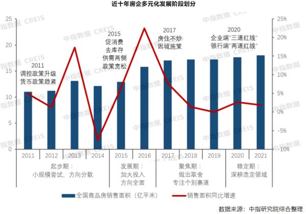 通过梳理房地产企业近十年来多元化转型的发展历程,中指研究院将其大概划分为四个阶段:起步期(2011年至2014年) ,发展期(2015年至2016年),聚焦期(2017年至2019年)及稳定期(2020年至今)。