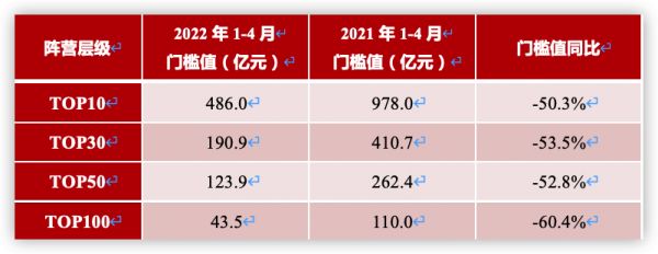 表:2022年1-4月各阵营销售额门槛值情况