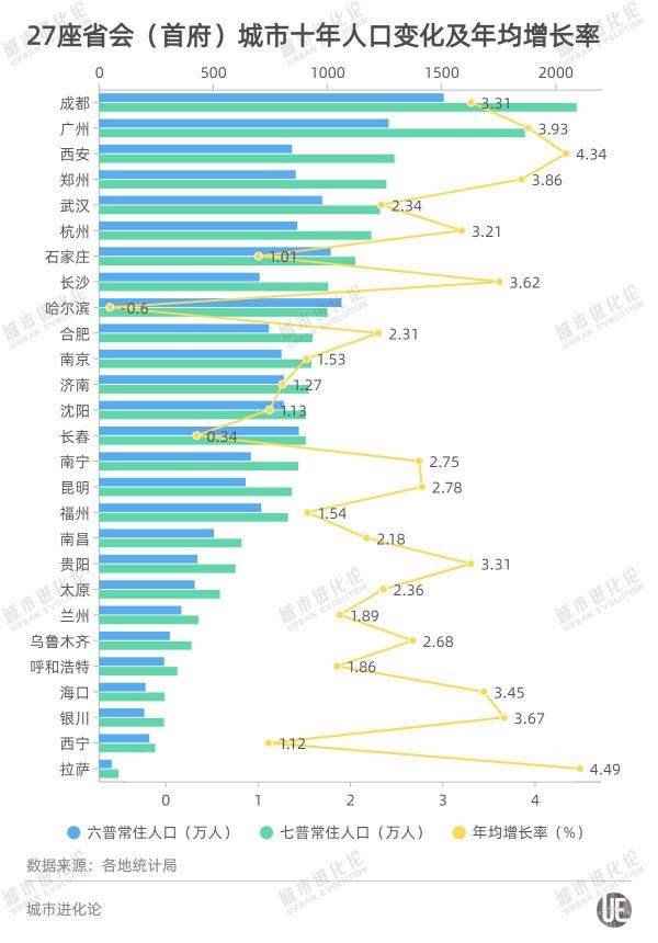 不过,放在全国省会(首府)城市来看,呼和浩特十年人口增量仅超过拉萨、长春、西宁及人口负增长的哈尔滨,位居倒数第五;1.86%的年均增长率,也仅排在倒数第9位。