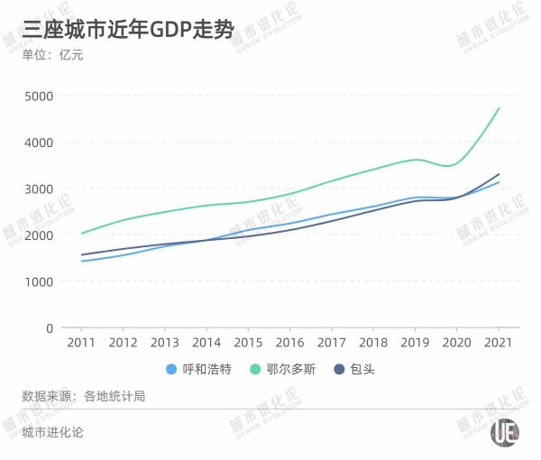 近年来,呼和浩特经济增速明显放缓,从2013年跌破两位数后震荡下行,连续多年跑输全国大盘。2021年,呼和浩特GDP终于跨上三千亿元台阶(3121.4亿元),却又被包头(3293亿元)反超,跟鄂尔多斯(600295)的差距也扩大至1600亿元左右。