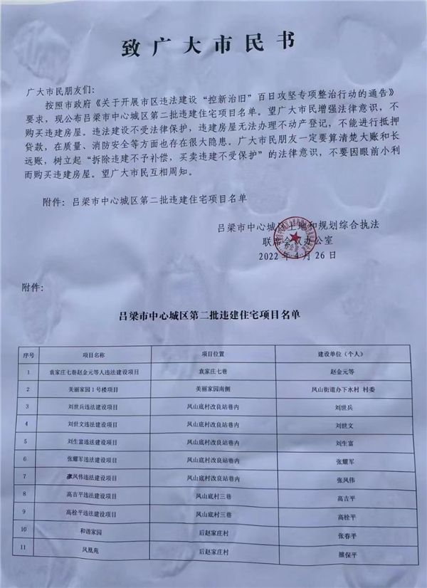 官宣!持续打击,山西吕梁第二批违建住宅项目名单公布