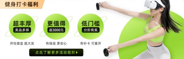用户在收货后1个月内联系奇遇官方店铺客服领取活动激活码,并在7个自然日内使用激活码完成活动激活即可参与活动。在此期间玩家使用机器体验VR内容,机器将自动记录对应的动作姿态并计算运动量,当有效运动时长最低达到30分钟即可达到打卡标准,系统自动完成打卡。每轮打卡设立连续完成30天、100天、300天三个目标,每完成一个目标可获得一个奇遇惊喜盒。