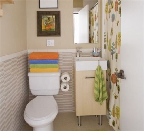 1、这是一个3平方的卫生间。但业主充分的利用了空间,看上去一点也不觉得拥挤。洗手间的左侧是一个马桶,水箱用来放置浴巾。主人还在卫生间后面的墙上挂了两幅抽象画,这样让浴室充满了艺术的气息。在简单的洗漱台旁边就是淋浴间,用彩色窗帘隔开。浴帘上带有精致的卡通图案,给浴室增添了一些温暖的活力。