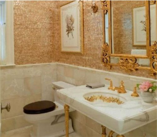 2、这个卫生间更加的奢华,主人并没有放太多的浴室用品。就一个简单的马桶和一个精致的洗漱台。墙的另一边设置了一个小玻璃浴室。它重点就是镜子和水龙头。甚至连洗脸台下面的水管都做了包装,墙上贴着金色的瓷砖并且挂了一幅金色相框画,给人一种宫廷文艺感。