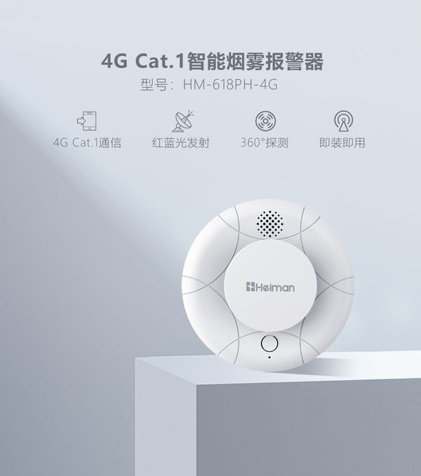 此次海曼科技中标中国联通雁飞Cat.1烟感型号HM-618PH-4G ,是基于4G Cat.1通信技术,采用新一代探测迷宫,结合红蓝光探测技术,敏锐捕捉、识别烟雾及水雾,避免误报。同时具备本地自检、离墙防拆、低压提醒等功能。当电池低压时,自动推送通知,提醒用户及时更换电池。