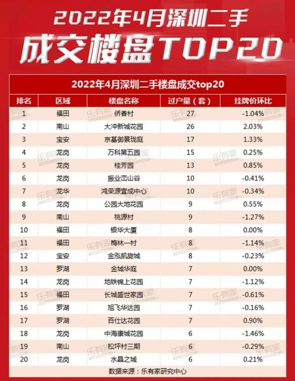 根据乐有家的数据,4月份深圳二手成交量最大的楼盘就是侨香村,过户量达到27套。