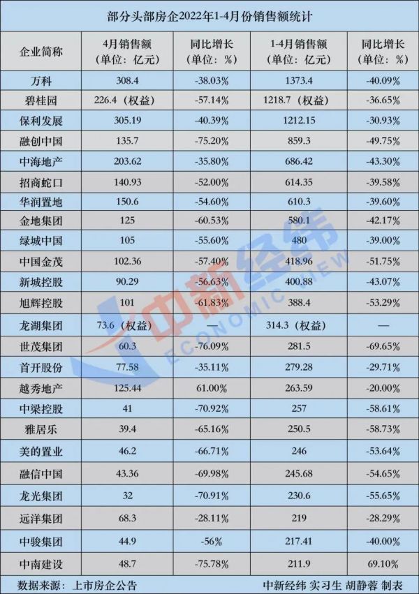 进入5月份,多家上市房企相继公布2022年1-4月份的销售业绩。据中新经纬不完全统计,截至5月13日,已公布销售业绩的头部房企,销售额几乎全部呈现负增长,其中,至少有18家房企4月份的销售额出现腰斩,同比下降超过50%。