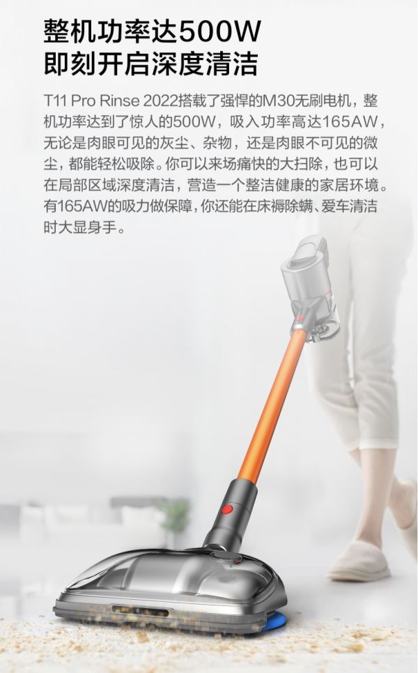 全新升级的小狗T11 Pro Rinse搭载拥有小狗核心技术的无刷电机,整机额定功率高达500W,单电机吸入功率高达165AW,急速气流可深入每个角落,灰尘、毛发、皮屑、螨虫等各类尘污一吸即净,轻松为用户带来干净清爽的家居环境,同时双排风降噪设计让小狗T11 Pro Rinse在工作时噪音不超过73dB(A),不会给家人日常生活带来干扰。