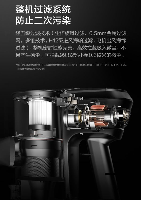 强劲吸力是吸尘器高效清洁的基础,而科学的导风通道、精密的过滤系统则是吸尘器持久耐用的保障。小狗T11 Pro Rinse采用了高速导风通道,进风面积大幅扩展,吸尘气旋通行顺畅,提升吸尘效率;尘桶内部结构同步优化,灰尘吸入阻力减少,机器可快速完成吸尘-储尘的过程。它还搭载了五级过滤技术,整机密封性能完善,可以拦截99.82%小至0.3微米的微尘,保证排风洁净无细微颗粒泄露,避免排风不干净造成的二次空气污染。