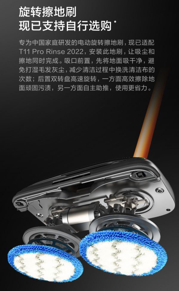 国内大部分家庭采用的是地板、地砖等硬质地面,先扫地再擦地是大部分国人的清洁习惯,吸尘器首先解决了除尘问题,再完善擦地功能是提升实用性的重点方向。为了满足不同用户的需求,小狗T11 Pro Rinse本次升级为用户提供了选装刷头——旋转擦地刷。