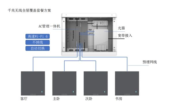 想要做到每个房间都有良好的Wi-Fi信号,采用AC+AP(AP,Access Point简称,即无线访问节点,无线AP是移动计算机用户进入有线网络的接入点)组网是最好的选择。