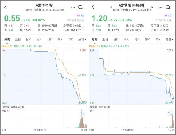 关联物管公司领悦服务集团(02165.hk)股价也暴跌59.60%,报收1.20港元/股,最新市值仅为3.43亿港元。