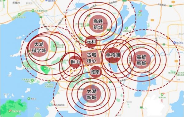 中间核心区由于文化街区保护无法开发,更多的概念则是外围的北部高铁新城、南部太湖新城、西部科技城和东部高贸新城。