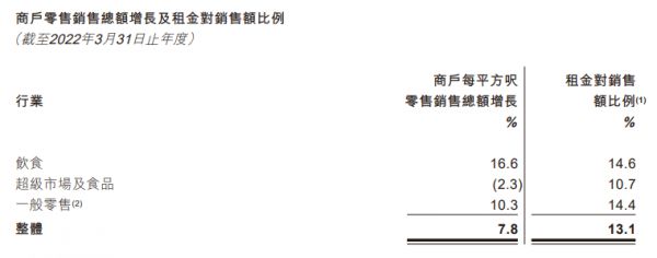 领展商户零售销售额增长及租金对销售额比例,截自领展年报