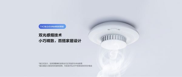 萤石T4C独立式烟感报警器采用独特的下沉式烟雾迷宫设计,将产品变得轻薄小巧,更能融入家庭环境。全新的双光感烟技术,相较于普通单光感烟技术,极大提升了可靠性及抗干扰能力。T4C支持360°全方位烟雾检测,灵敏感知烟雾,性能稳定。当检测到烟雾时,发出高音蜂鸣与红灯快闪双重告警,并实时推送告警消息。