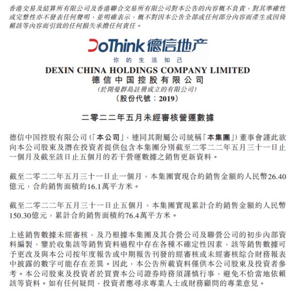 【环球网房产报道】6月6日,德信中国控股有限公司(02019.HK)披露2022年5月未经审核合同销售数据。
